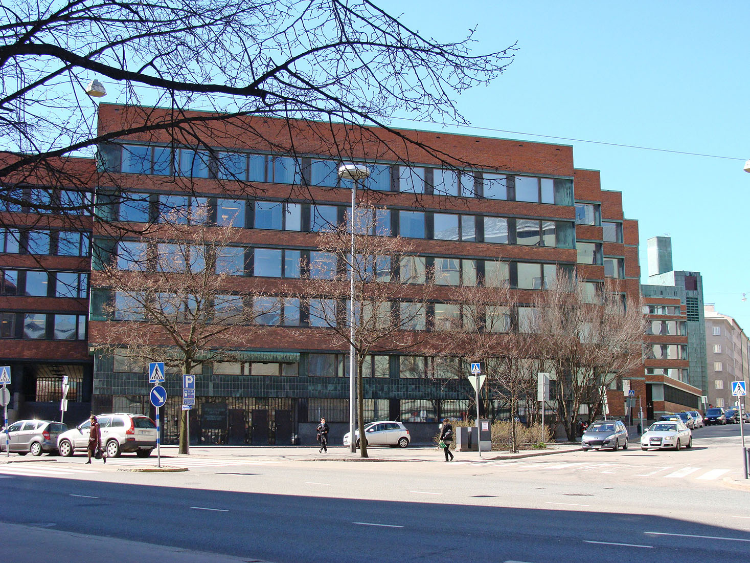 The architectural competiton to design an office complex for the National Pensions Institute in Helsinki was won by Aino and Alvar Aalto in 1948. The original design was scrapped in 1952, when an alternative site with a triangular shape was selected. As a consequence of this smaller parcel, none of the commercial and cultural facilities, which were included in the original competition proposal, could be fitted. In the end only the offices and additional spaces were realized and construction was finished in 1956. There was a requirement for a total of 800 workplaces within this administrative building. One of the key-ideas of the design was to accomodate this large amount of employees in an environment avoiding the opressive feeling known from the box-like office buildings located in rather crampy city districts. This large construction, comprising a total volume of 110'000 cubic meters, is structured in different wings and develops around a garden court which is shielded from traffic noise. All wings are connected to each other, partially by subterranean constructions, so that the various volumes create an organic entity. The complex of an irregular U-shape is stepped down towards the nearby park and surrounds the mentioned courtyard, which is raised above street level. The customer service hall, which is the only space accessible for the general public, is the centrepiece of the interior. Extending over a height of three floors, it is lit from above by three prism-shaped lantern skylights. Originally this room contained 28 unroofed interview cubicles. Another space of special interest is the tiny library, which features specialist insurance literature, and which is considered to be a miniature version of Aalto's famous Viipuri library. On the exterior are used mainly red brick, copper and black granite. Large parts of the building are characterised by horizontal strip windows. Closed areas of copper sheet emphasize the vertical, contrasting with the horizontal appearance of the whole complex. Impressive are the materials and workmanship of high quality used in the whole building, but especially for the management floor and the conference room. Every detail within this large complex is carefully studied. In this building were used several innovative building methods, which where then considered to be experimental. For example were evaluated sound-absorbing walls for the protection of the working environment as well as radiation heating with visible installations. Alvar Aalto himself said about this building: 'Although the building is equipped with mechanical ventilation connected with the heating system, the architect wished to provide every room with the biological advantages of natural airing and a window that can be opened.' |