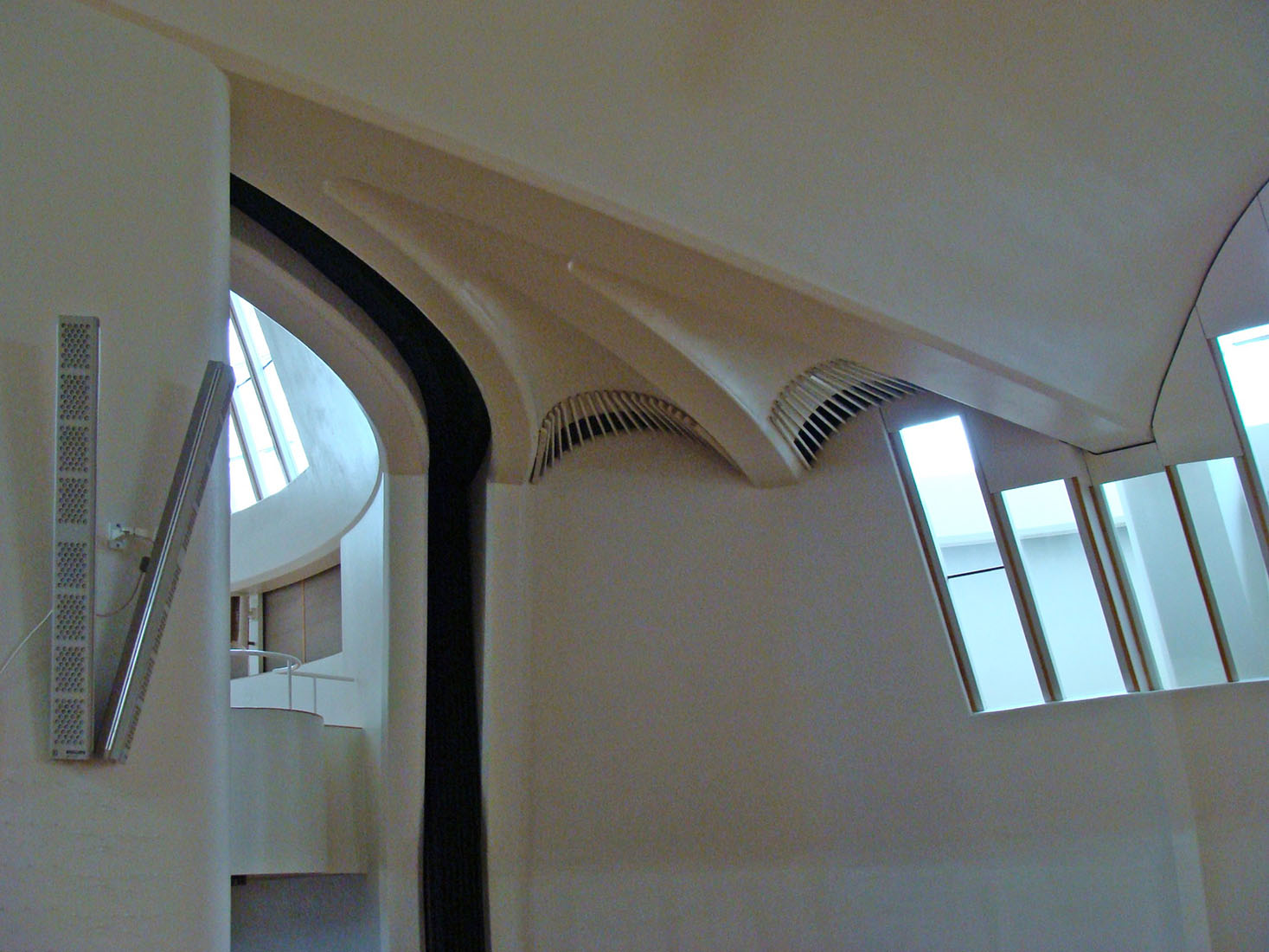 Additionally to the cited seqences, Alvar Aalto also gives some insight into the construction and layout of the building. The façade is made of brick and concrete and rendered white. A roof made of copper sheet hangs down low on the east side. The vaulted interior was elaborated empirically, with the intention to realize favorable acoustics. This work was carried out with the help of a miniature model, in