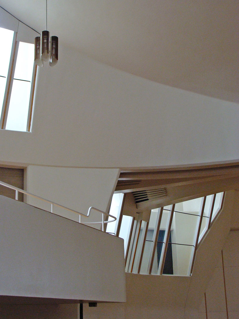 In 1953 Alvar Aalto completed his work for the Imatra master plan, two years later he started to wor on the drawings for the Vuoksenniska Church in Imatra. This Church, which was completed in 1958, is considered to be an important work, and becam very well known. The official name of the church is the Church of the Three Crosses. The Vuoksenniska Church is considerd to be Alvar Aalto's most original church design. His design is based an a synthesis of various practical and aesthetic needs, fusing a broad range of motis into a coherent work of architectural perfection. The architect himself explained some of the key problems for his draft with the following words: 'Church activities in an industrial community naturally focus on social work. The world has many combinations of different kinds - one can only regret that the satisfaction of social needs has tended to deprive churches of their proper character as public buildings. Very often they are a kind of conglomeration of settlement house, youth and parish club, and parish meeting hall, with space for modest truly religious functions thrown in for good measure. The architect aimed at the full form of a church, while seeking to provide adequately for social activities without compromises. The basic design of the church consists of a series of three consecutive halls. We may call these halls A, B, and C; A being the sanctuary proper, while the other spaces can be added if necessary by means of moveable walls. On weekdays halls B and C can be used for parish activities. Each section has just under 300 seats, A and B together approximately 600, and all halls combined 800. The halls are separated by walls some 42 cm thick, sliding on a system of ball bearings in oil, and heavy enough to provide complete sound insulation. Part of the moving wall is flat, part of it is made up of cylindrical surfaces.' And more in detail, Alvar Aalto spoke about the Vuoksenniska Church: 'Divine service in a Lutheran church calls for three architectural focuses: the altar, the pulpit, and an organ loft for music and choir. All three are accommodated within a triangular form in the main church, A. As the most sacred section of the church, the altar is centrally placed, and the pulpit is generally relegated to one side. Considering that the audibility of the sermon is the most important and most difficult problem in a Lutheran church, this should logically result in an asymmetrical church interior. The long wall that diagonally faces the pulpit determines the reflection of sound to a much higher degree than the other walls. Correct design of this wall gives rise to optimum projection of sound to the congregation. In this case the acoustic wall consists of surfaces in various curved and arched forms. The whole wall, including the window surfaces, leans inward. The rounded parts of the moveable walls link up with the curve of the main wall.' Another important feature of the building is explaned by the architect as follows: 'The bell tower is dominated by the number three: its top section is tripartite, and widens upward. With this form the architect wished to create an architectural image that contrasts as strongly as possible with the factory chimneys which dominate the surroundings. The triad recurs inside in the vault which covers the three halls. The motif converges at the altar in three unpretentious crosses... The white interior has as its only accent of colour a symbolic stained-glass work depicting a crown of thorns in the principal windows on the west wall.' Additionally to the cited seqences, Alvar Aalto also gives some insight into the construction and layout of the building. The façade is made of brick and concrete and rendered white. A roof made of copper sheet hangs down low on the east side. The vaulted interior was elaborated empirically, with the intention to realize favorable acoustics. This work was carried out with the help of a miniature model, in which rays of light were directed vertically and horizontally from the site of the pulpit onto small mirrors in the ceiling and walls, the premise being that sound waves are reflected in the same way as light. The walls on the east side, between which the curved sliding walls can be hidden, have a completely different design. To ensure undisturbed separate use of the three sections, the Vuoksenniska Church has a total of five entrances. Hall A can also be used as a funeral chapel with a ceremonial exit straight to the graveyard in a beautiful pine forest setting. |