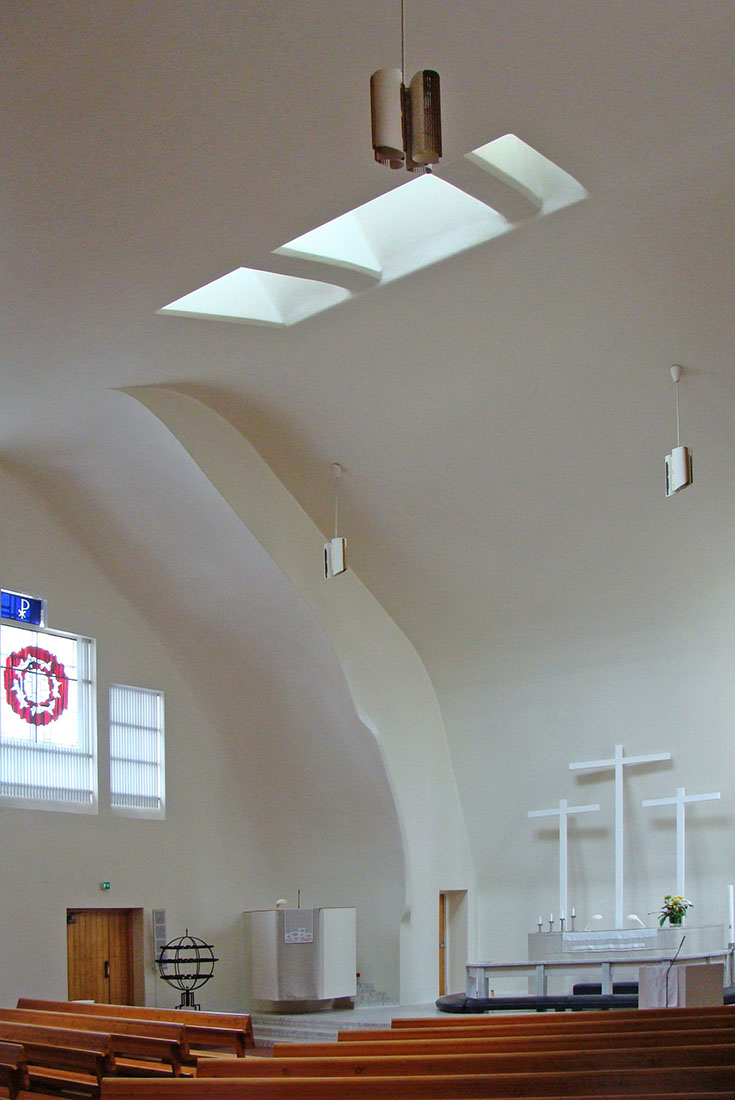 In 1953 Alvar Aalto completed his work for the Imatra master plan, two years later he started to wor on the drawings for the Vuoksenniska Church in Imatra. This Church, which was completed in 1958, is considered to be an important work, and becam very well known. The official name of the church is the Church of the Three Crosses. The Vuoksenniska Church is considerd to be Alvar Aalto's most original church design. His design is based an a synthesis of various practical and aesthetic needs, fusing a broad range of motis into a coherent work of architectural perfection. The architect himself explained some of the key problems for his draft with the following words: 'Church activities in an industrial community naturally focus on social work. The world has many combinations of different kinds - one can only regret that the satisfaction of social needs has tended to deprive churches of their proper character as public buildings. Very often they are a kind of conglomeration of settlement house, youth and parish club, and parish meeting hall, with space for modest truly religious functions thrown in for good measure. The architect aimed at the full form of a church, while seeking to provide adequately for social activities without compromises. The basic design of the church consists of a series of three consecutive halls. We may call these halls A, B, and C; A being the sanctuary proper, while the other spaces can be added if necessary by means of moveable walls. On weekdays halls B and C can be used for parish activities. Each section has just under 300 seats, A and B together approximately 600, and all halls combined 800. The halls are separated by walls some 42 cm thick, sliding on a system of ball bearings in oil, and heavy enough to provide complete sound insulation. Part of the moving wall is flat, part of it is made up of cylindrical surfaces.' And more in detail, Alvar Aalto spoke about the Vuoksenniska Church: 'Divine service in a Lutheran church calls for three architectural focuses: the altar, the pulpit, and an organ loft for music and choir. All three are accommodated within a triangular form in the main church, A. As the most sacred section of the church, the altar is centrally placed, and the pulpit is generally relegated to one side. Considering that the audibility of the sermon is the most important and most difficult problem in a Lutheran church, this should logically result in an asymmetrical church interior. The long wall that diagonally faces the pulpit determines the reflection of sound to a much higher degree than the other walls. Correct design of this wall gives rise to optimum projection of sound to the congregation. In this case the acoustic wall consists of surfaces in various curved and arched forms. The whole wall, including the window surfaces, leans inward. The rounded parts of the moveable walls link up with the curve of the main wall.' Another important feature of the building is explaned by the architect as follows: 'The bell tower is dominated by the number three: its top section is tripartite, and widens upward. With this form the architect wished to create an architectural image that contrasts as strongly as possible with the factory chimneys which dominate the surroundings. The triad recurs inside in the vault which covers the three halls. The motif converges at the altar in three unpretentious crosses... The white interior has as its only accent of colour a symbolic stained-glass work depicting a crown of thorns in the principal windows on the west wall.' Additionally to the cited seqences, Alvar Aalto also gives some insight into the construction and layout of the building. The façade is made of brick and concrete and rendered white. A roof made of copper sheet hangs down low on the east side. The vaulted interior was elaborated empirically, with the intention to realize favorable acoustics. This work was carried out with the help of a miniature model, in which rays of light were directed vertically and horizontally from the site of the pulpit onto small mirrors in the ceiling and walls, the premise being that sound waves are reflected in the same way as light. The walls on the east side, between which the curved sliding walls can be hidden, have a completely different design. To ensure undisturbed separate use of the three sections, the Vuoksenniska Church has a total of five entrances. Hall A can also be used as a funeral chapel with a ceremonial exit straight to the graveyard in a beautiful pine forest setting. |