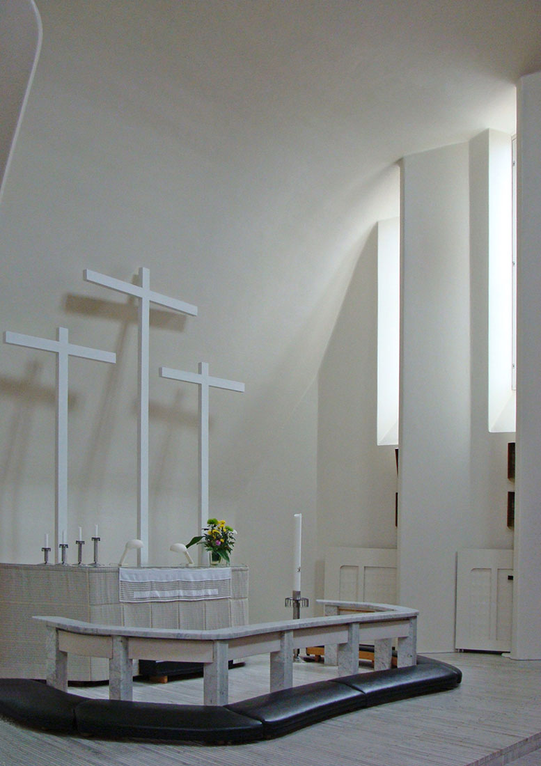 In 1953 Alvar Aalto completed his work for the Imatra master plan, two years later he started to wor on the drawings for the Vuoksenniska Church in Imatra. This Church, which was completed in 1958, is considered to be an important work, and becam very well known. The official name of the church is the Church of the Three Crosses. The Vuoksenniska Church is considerd to be Alvar Aalto's most original church design. His design is based an a synthesis of various practical and aesthetic needs, fusing a broad range of motis into a coherent work of architectural perfection. The architect himself explained some of the key problems for his draft with the following words: 'Church activities in an industrial community naturally focus on social work. The world has many combinations of different kinds - one can only regret that the satisfaction of social needs has tended to deprive churches of their proper character as public buildings. Very often they are a kind of conglomeration of settlement house, youth and parish club, and parish meeting hall, with space for modest truly religious functions thrown in for good measure. The architect aimed at the full form of a church, while seeking to provide adequately for social activities without compromises. The basic design of the church consists of a series of three consecutive halls. We may call these halls A, B, and C; A being the sanctuary proper, while the other spaces can be added if necessary by means of moveable walls. On weekdays halls B and C can be used for parish activities. Each section has just under 300 seats, A and B together approximately 600, and all halls combined 800. The halls are separated by walls some 42 cm thick, sliding on a system of ball bearings in oil, and heavy enough to provide complete sound insulation. Part of the moving wall is flat, part of it is made up of cylindrical surfaces.' And more in detail, Alvar Aalto spoke about the Vuoksenniska Church: 'Divine service in a Lutheran church calls for three architectural focuses: the altar, the pulpit, and an organ loft for music and choir. All three are accommodated within a triangular form in the main church, A. As the most sacred section of the church, the altar is centrally placed, and the pulpit is generally relegated to one side. Considering that the audibility of the sermon is the most important and most difficult problem in a Lutheran church, this should logically result in an asymmetrical church interior. The long wall that diagonally faces the pulpit determines the reflection of sound to a much higher degree than the other walls. Correct design of this wall gives rise to optimum projection of sound to the congregation. In this case the acoustic wall consists of surfaces in various curved and arched forms. The whole wall, including the window surfaces, leans inward. The rounded parts of the moveable walls link up with the curve of the main wall.' Another important feature of the building is explaned by the architect as follows: 'The bell tower is dominated by the number three: its top section is tripartite, and widens upward. With this form the architect wished to create an architectural image that contrasts as strongly as possible with the factory chimneys which dominate the surroundings. The triad recurs inside in the vault which covers the three halls. The motif converges at the altar in three unpretentious crosses... The white interior has as its only accent of colour a symbolic stained-glass work depicting a crown of thorns in the principal windows on the west wall.' Additionally to the cited seqences, Alvar Aalto also gives some insight into the construction and layout of the building. The façade is made of brick and concrete and rendered white. A roof made of copper sheet hangs down low on the east side. The vaulted interior was elaborated empirically, with the intention to realize favorable acoustics. This work was carried out with the help of a miniature model, in which rays of light were directed vertically and horizontally from the site of the pulpit onto small mirrors in the ceiling and walls, the premise being that sound waves are reflected in the same way as light. The walls on the east side, between which the curved sliding walls can be hidden, have a completely different design. To ensure undisturbed separate use of the three sections, the Vuoksenniska Church has a total of five entrances. Hall A can also be used as a funeral chapel with a ceremonial exit straight to the graveyard in a beautiful pine forest setting. |
