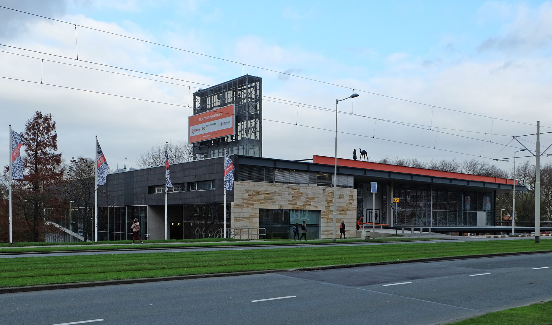 The Kunsthalle Rotterdam is part of the Museumspark and is located in the neighborhood of the Dutch Architecture Institute and the Boijmans van Beuningen Museum. The building, designed by the Office of Metropolitan Architecture, is located directly on the Maasboulevard, an expressway on one of the largest dikes of Rotterdam. The building is designed as a bridge between the busy expressway and the museum park to the north. The volume is divided into four autonomous parts, which are formed by two intersections. A road running east / west across the site forms the first intersection. The broad pedestrian ramp, which runs through the building in the north / south direction forms the second intersection. According to the architects, this ramp will allow a gentle transition from the dyke to the museum park on a lower level.