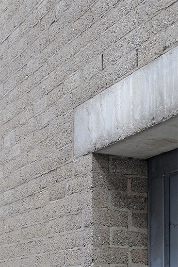 The structure of the building consists of a reinforced concrete construction. The double-shell exterior walls expose a surface of bricked concrete blocks and visible concrete beams above the openings. The openings are sharply cut-out and deeply recessed. The largest opening is corresponding to the above-mentioned passage for the underground garage. The window sills are finished with brown tiles and the few window frames are made of white painted metal. The facade is free and plastically designed as a dynamic composition of abstract geometric masses and voids. The three openings in the main facade, providing natural light for the living room and the gallery, intertwine with the vertical exterior space. The openings are irregularly distributed on the surface of the façade. Due to the clever arrangement, the composition is balanced and appears to be centered despite its obvious asymmetry. Above the first floor, where the public gallery is separated from the private apartment, the volumetry creates projections and incisions with terraces for the two top floors. The massive and closed appearance towards the street is appropriate to the plot in the old town.