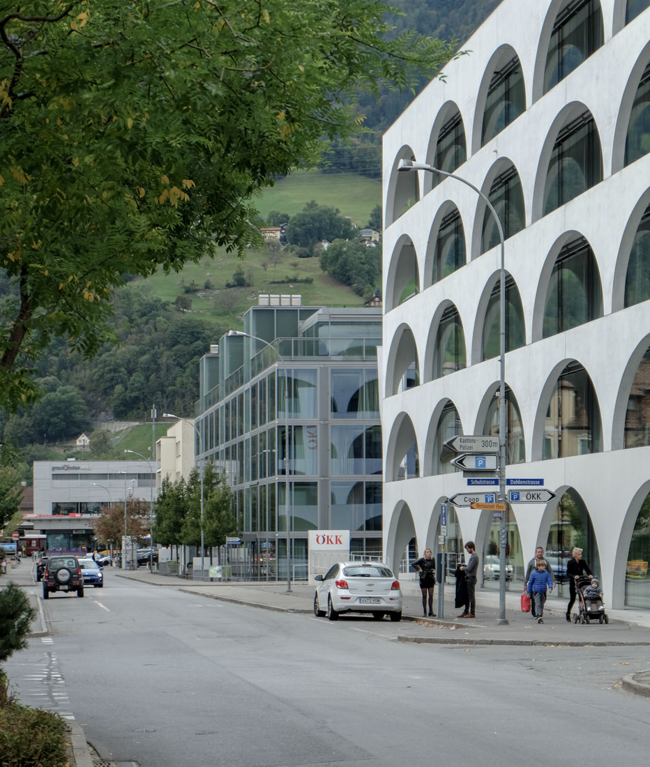 Im Jahr 2012 konnten Bearth & Deplazes das neu ÖKK Hauptquartier in Landquart fertigstellen. Das Gebäude befindet sich in unmittelbarer Nachbarschaft des Bürogebäudes, welches die Architekten einige Jahre zuvor für die selbe Firma errichten konnten. Das Gebäude richtet sich mit seinem Restaurant, einem Saal und dem Vorplatz an die Öffentlichkeit. Entsprechend wurde ein repräsentativer Ausdruck gewählt. Das Gebäude versteht sich in der Tradition der italienischen Stadt-Palazzos. Errichtet wurde das Gebäude als sogenannter Edelrohbau, mit Fassadenschale und inneren Tragwänden aus weissem Sichtbeton. Die Fassadenschale wurde mit einer Abfolge von halbkreisförmigen Bögen so intensiv wie möglich perforiert. Durch die Anneinanderreihung des gleichbleibenden Elementes entsteht eine Art Bogenarkade. Durch die Vorfertigung der T-förmigen Scheiben konnte eine hohe Ausführungsqualität gewährleistet werden. Die fünf überirdischen Stockwerke des Massivbaus wurden wie Tische übereinandergestellt. Dabei ist jeweils der obere Bereich der Fassadenschale breit in die Deckenplatten eingespannt, währenddem unten schmale Auflagerflächen ausreichen. Die Decken bestehen aus gerippten Betonelementen. Gegenüber der Fassadenschale zurückversetzt verläuft die Verglasung als thermische Hülle. Es entsteht eine raumhaltige Fassade, mit ausgeprägter Tiefenwirkung. Durch die grosszügige Verglasung werden die Büros von Aussen überdurchschnittlich gut mit Naturlicht versorgt. Nach innen gibt es offene Plattformen zum Lichthof, welcher sich über die Gebäudehöhe erstreckt und verjüngt. |