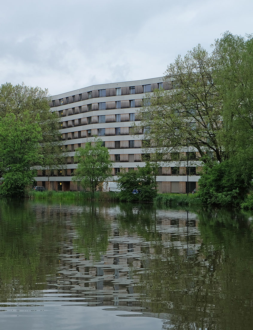 Most of the apartments in both buildings have living/dining/kitchen areas that extend through the building, opening onto both the green inner courtyard and the pond or stream. The subtle angling of the balconies offers outdoor areas of varying depths and provides a formal echo to the large-scale angled sections of the two buildings, adding a lively and sculptural touch to the volumes of these two housing ensembles. The solid construction has a rear ventilated façade that consists of layered, rhythmically offset and thermally modified spruce planks and prefabricated concrete bands, which protrude somewhat beyond the wooden cladding to protect it from the weather. At the balconies the concrete band projects further forward to form the parapet. (Text: Gigon Guyer) Das ehemalige Industrieareal Zellweger zeichnet sich durch ausserordentliche landschaftliche Qualitäten aus. Zwei grosse Weiher, die ursprünglich zur Gewinnung von Wasserkraft angelegt worden waren, ein Flusslauf und ein parkartiger alter Baumbestand prägen das Gelände. Das Grundstück wird durch den Zellweger-Weiher und den Aabach begrenzt. Zwei unterschiedlich hohe Wohngebäude werden hier so gesetzt, dass sie jeweils der Platanenallee am Weiher im Norden und dem baumgesäumten Bachverlauf im Südosten folgen. Sie spannen einen L-förmigen Grünraum zwischen sich auf. Dieser Zwischenraum öffnet sich im Westen einem Baumfeld und dem bestehenden hohen Bürogebäude. Breite Zugangswege führen über den grünen Zwischenraum, der unter sich die Garage birgt, zu den beiden Häusern. Kiefern sind als Baumskulpturen auf die sanft modellierte Rasenfläche gesetzt. Die privaten Vorgärten im Erdgeschoss werden mit Fichtenholzlamellen vom öffentlichen Grünraum abgegrenzt. Sie werden gerahmt von offenen, eleganten Betonstrukturen, die zugleich Veloabstellplätze, Briefkastenfronten und Kamine für die natürliche Belüftung der Tiefgarage formen. Das nördliche, achtgeschossige Gebäude entlang der Weiherallee beherbergt 74 Mietwohnungen, ein Bistro, zwei Kinderkrippen und einen Hort. Das drei- bis fünfgeschossige Gebäude am neuen Zellwegerweg, entlang des Aabaches gelegen, enthält 61 Mietwohnungen und einen Gemeinschaftsraum. Die Mehrzahl der Wohnungen in beiden Gebäuden hat durchgehende Wohn-/ Ess-/ Küchenräume mit einem beidseitigen Bezug sowohl zum grünen Innenhof als auch zum Weiher oder Bach. Das Prinzip des durchgesteckten Wohn-/ Essraums wurde in den beiden Gebäuden unterschiedlich ausformuliert. Im Gebäude am Zellwegerweg verjüngt sich der Raum in der Mitte, um einen Eingangsbereich auszubilden. Auf beiden Seiten dieser Eingangszone weitet sich der Raum wieder aus, um versetzt zueinander eigenständige Zonen für das Wohnzimmer und die Wohnküche zu schaffen. Die Zimmer sind peripher um diesen zentralen Raum angeordnet. Im Gebäude an der Weiherallee bildet die Eingangszone gleichzeitig die Erschliessung der Zimmer und führt zum durchgehenden Wohn-/ Essraum. Die feinen Knicke der Balkone bieten unterschiedlich tiefe Aussenräume an und nehmen formal die grossen Knicke der beiden Baukörper auf, wodurch deren Volumen plastisch animiert wird. Die Fassaden gliedern sich schichtweise in Verkleidungen aus rhythmisiert versetzten, thermobehandelten Fichtenholzbrettern und durchbrochene Brüstungsbänder aus vorfabriziertem weissen Beton, die gegenüber den Holzbrettern erhaben sind und diese vor Witterung schützen. An den Balkonen tritt die Betonbrüstung nach vorn, die hölzerne Verkleidung nach hinten. (Text: Gigon Guyer) |