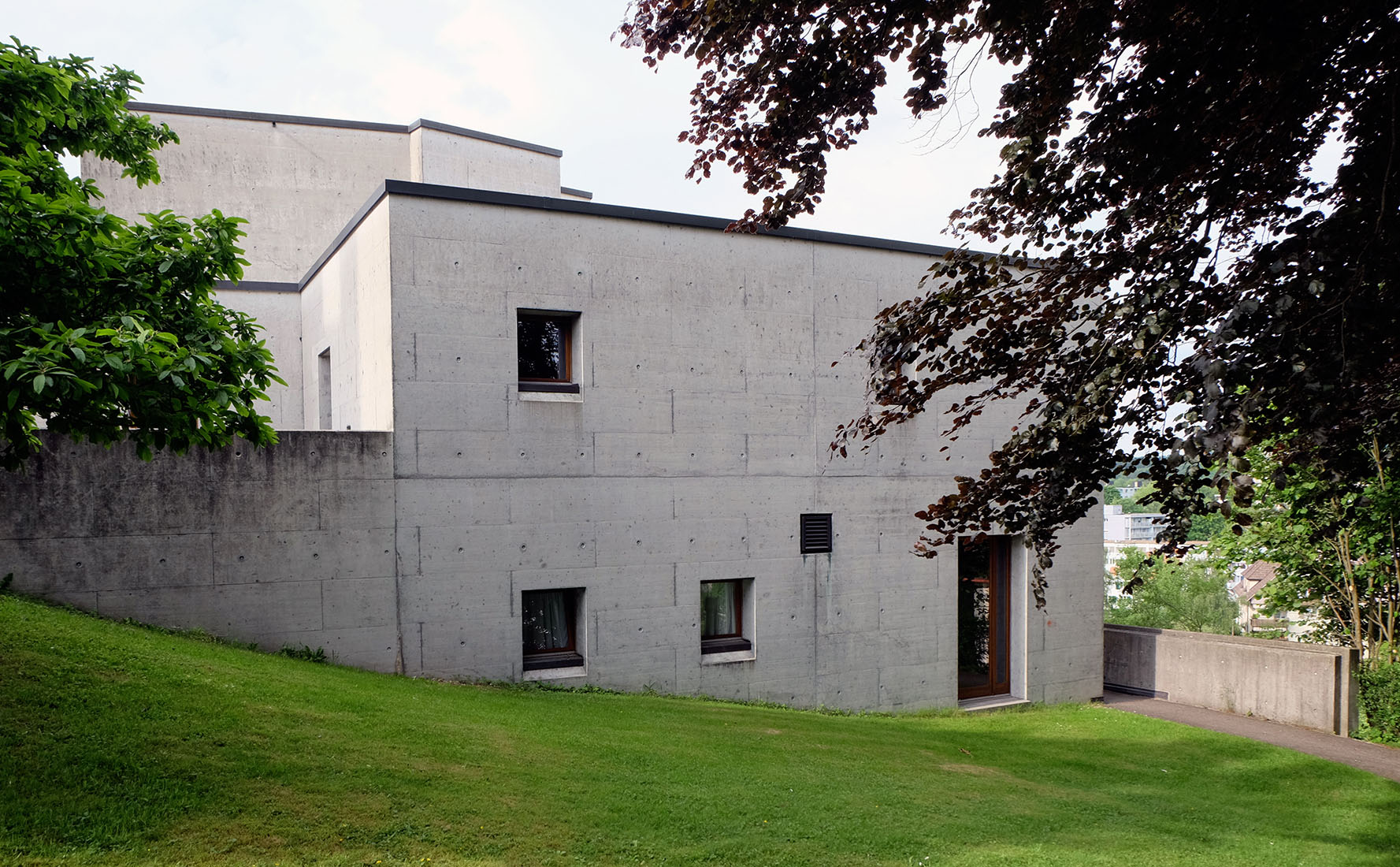 It was implemented at a time when in the Catholic and in the Reformed Church was held a very lively discussion about the building of churches. The advantages and disadvantages of central buildings or longitudinal buildings were discussed in different medias. During the design process of the Church of Effretikon these issues were dealt with only marginally. A rather unusual procedure resulted in the commissioning of Ernst Gisel for the design of the Reformed Church Effretikon. In 1956 a competition under ten invited architects was carried out. Ernst Gisel had proposed a strict, box-like structure. This design was not awarded a prize. Unusually in this competition was the fact that the three first ranked projects were commissioned for revised proposals, the other architects were admitted but without compensation for the next stage. In the guidelines for further development, proposals for a church with a flat roof were ruled out - probably under the influence of the design of Ernst Gisel. The client wished a building with the character of a simple church. Ernst Gisel, who had completely revised his project, was the winner of this second stage. In the new desing, he placed the church on a pedestal, in which a large, expandable community hall was housed. A pitched roof with a transverse ridge rises above the church. The interior space of the church and the roof were aligned in a way that the lowest point comes of the space corresponds to the altar. The space obtained by the pitched roof, the lighting and the axial organization result in a clear orientation to the east, although the ground plan corresponds to a square. The design which was destined for execution has been completely revised again. The requirements for the spaces had changed, and there was no more need for a large community hall. At this stage, Ernst Gisel dropped the concept of the competition. The church and the hill are no longer separated by the base. Rather, the church can now be interpreted as a continuation of the hill. The orientation of the church has been rotated by ninety degrees to the north. The staggered massing in exposed concrete with the tent-like roof are modeled onto the northern slope. Togehter with the hill, the building creates a church square. By contrast, the bell tower remained at the originally proposed location, but was transformed into a mighty concrete sculpture. The interior of the church impresses with a simple yet sophisticated room and lighting concept. Here, the original square plan was abandoned. The staggering of the west wall permits an interior zoning into liturgical areas. At the same time the skylights which drop the light from the south in the nave and onto the altar area are a result of this staggering. The design motive of the staggering is again encountered in the entrance hall and on the altar wall. The use of red brick for the walls and floors and the white varnished pine paneling of the roof soffit leave unite the apearance of the room. Parallel to the church nave and the side aisle a community hall was arranged, which can be open towards the church by sliding walls. The exterior of the church is characterized by the plasticity of the exposed concrete and by the big roof which is covered with fiber cement. The already mentioned church tower is one of the most striking features of this design. This bell tower got recognition in international commentary as one of the most powerful architectural sculptures ever. Originally this church tower has been heavily criticized. Today the quality of the whole composition is widely recognized. Due to the changed spatial needs in the late 1980s, it was considered to realize the originally planned large community hall as an annex. In 1994/95 an extension of the church building was then carried out to the east by Ernst Gisel. The new dividable multipurpose hall can be combined with the small hall of the original building. All three areas can be separated if necessary. When open, they make up a spatial continuum. |