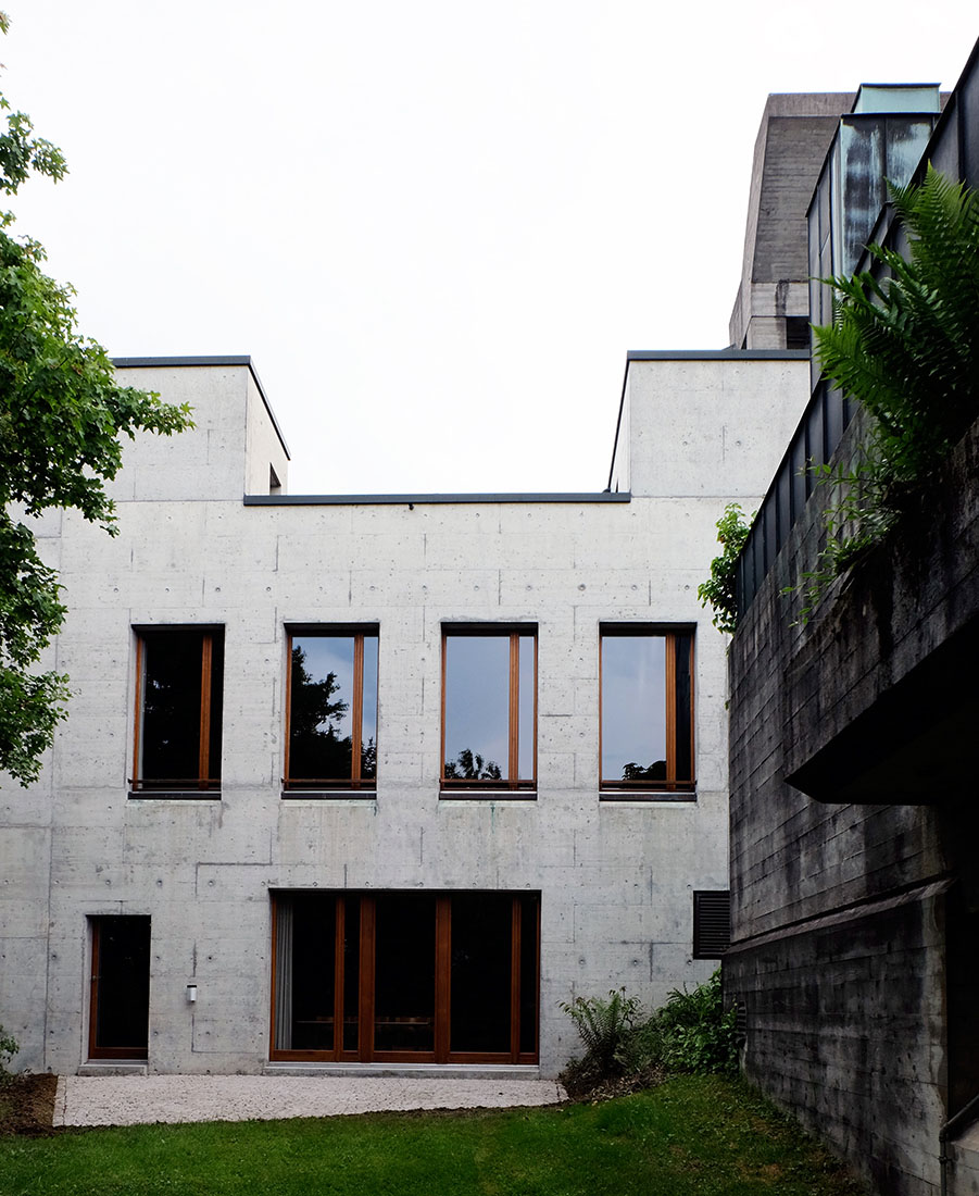 It was implemented at a time when in the Catholic and in the Reformed Church was held a very lively discussion about the building of churches. The advantages and disadvantages of central buildings or longitudinal buildings were discussed in different medias. During the design process of the Church of Effretikon these issues were dealt with only marginally. A rather unusual procedure resulted in the commissioning of Ernst Gisel for the design of the Reformed Church Effretikon. In 1956 a competition under ten invited architects was carried out. Ernst Gisel had proposed a strict, box-like structure. This design was not awarded a prize. Unusually in this competition was the fact that the three first ranked projects were commissioned for revised proposals, the other architects were admitted but without compensation for the next stage. In the guidelines for further development, proposals for a church with a flat roof were ruled out - probably under the influence of the design of Ernst Gisel. The client wished a building with the character of a simple church. Ernst Gisel, who had completely revised his project, was the winner of this second stage. In the new desing, he placed the church on a pedestal, in which a large, expandable community hall was housed. A pitched roof with a transverse ridge rises above the church. The interior space of the church and the roof were aligned in a way that the lowest point comes of the space corresponds to the altar. The space obtained by the pitched roof, the lighting and the axial organization result in a clear orientation to the east, although the ground plan corresponds to a square. The design which was destined for execution has been completely revised again. The requirements for the spaces had changed, and there was no more need for a large community hall. At this stage, Ernst Gisel dropped the concept of the competition. The church and the hill are no longer separated by the base. Rather, the church can now be interpreted as a continuation of the hill. The orientation of the church has been rotated by ninety degrees to the north. The staggered massing in exposed concrete with the tent-like roof are modeled onto the northern slope. Togehter with the hill, the building creates a church square. By contrast, the bell tower remained at the originally proposed location, but was transformed into a mighty concrete sculpture. The interior of the church impresses with a simple yet sophisticated room and lighting concept. Here, the original square plan was abandoned. The staggering of the west wall permits an interior zoning into liturgical areas. At the same time the skylights which drop the light from the south in the nave and onto the altar area are a result of this staggering. The design motive of the staggering is again encountered in the entrance hall and on the altar wall. The use of red brick for the walls and floors and the white varnished pine paneling of the roof soffit leave unite the apearance of the room. Parallel to the church nave and the side aisle a community hall was arranged, which can be open towards the church by sliding walls. The exterior of the church is characterized by the plasticity of the exposed concrete and by the big roof which is covered with fiber cement. The already mentioned church tower is one of the most striking features of this design. This bell tower got recognition in international commentary as one of the most powerful architectural sculptures ever. Originally this church tower has been heavily criticized. Today the quality of the whole composition is widely recognized. Due to the changed spatial needs in the late 1980s, it was considered to realize the originally planned large community hall as an annex. In 1994/95 an extension of the church building was then carried out to the east by Ernst Gisel. The new dividable multipurpose hall can be combined with the small hall of the original building. All three areas can be separated if necessary. When open, they make up a spatial continuum. |
