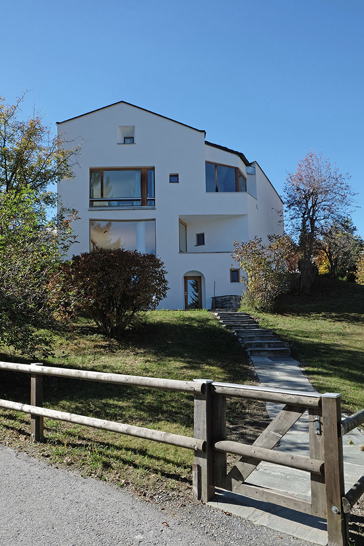 Das Haus Dr. Witzig aus dem Jahr 1966 befindet sich an einer Hanglange in Flims Waldhaus. Das von Rudolf Olgiati entworfene Gebäude ist von turmartiger Gestalt und thront über dem Abhang. Das Gebäude wurde über einem beinahe quadratischen Grundriss errichtet, wobei allerdings eine Ecke abgeschnitten , und das Gebäude plastisch ausgestaltet wurde. Entsprechend differenziert zeigen sich die einzelnen Fassaden. Die Hauptfassade zum Tal erscheint aufgrund eines Einschnitts im Dachbereich als eine schmale Giebelseite. Die gegenüberliegende Fassade erscheint hingegen als breite, asymmetrische Giebelseite mit zahlreichen Fenstern unterschiedlicher Grösse, welche unregelmässig angeordnet sind. Zudem wird die Fassade von zwei betonierten Speiern durchdrungen. Während dem sich die Fassade mit Garagenzufahrt und zweiter Eingangstüre als Rückseite zu erkennen gibt, erweist sich die gegenüberliegende Fassade wiederum als Schauseite mit ebenerdigem, grosszügig verglastem Sitzplatz. Dieser wird von einem schlanken Betonvordach geschützt, welches auf zwei massiven Betonsäulen ruht. Über diesem Vordach befindet sich eine weitere, grosszügige Verglasung für die Schlafzimmer des Obergeschoss. Zudem ist die Fassade im Bereich der Sonnenterrasse, welche das Dachgeschoss belichtet, teilweise abgesenkt. Der Haupteingang zum Haus Dr. Witzig befindet sich im eigentlichen Untergeschoss, welches lediglich zur Talseite in Erscheinung tritt. Hier befindet sich am Ende des langen Zugangspfades mit sanft ansteigender Treppe die verglaste Haustüre mit bogenförmigem Abschluss. In diesem nur teilweise unterkellerten Untergeschoss befinden sich der Tankraum, ein Heizungsraum sowie der Schutzraum. Direkt anschliessend an Eingang führt eine leicht gebogene Treppe in das eigentliche Erdgeschoss. Dieses Stockwerk entspricht dem hauptsächlichen Wohngeschoss. Die Treppe führt auf den Vorbereich des zweiten Eingangs. Hier befinden sich die Küche, eine artikulierte Essnische mit grossem Trichterfenste, der Wohnraum und eine Toilette. Im Wohnraum befindet sich eine Feuerstelle mit seitlich angeordnetem Sitzmöbel. Gegenüber der Feuerstelle befindet sich die grosszügige Verglasung mit Ausgang zum Gartensitzplatz. im Innenraum befindet sich zudem eine weitere, plastische Säule aus Beton, welche direkt vor der Verglasung zur Talseite angeordnet wurde. Eine organisch geformte Treppe führt in elegantem Schwung ein Stockwerk höher. Entlang dieser Treppe verläuft eine raumhaltige Wandkonstruktion, welche gleichzeitig als Bücherregal dient. Im Obergeschoss befinden sich vier Schlafzimmer und zwei Nasszellen mit Badewanne respektive Dusche. Eine schmalere, linear verlaufende Treppe führt in das Dachgeschoss. Hier befinden sich zwei weitere Schlafzimmer und die Sonnenterasse, welche hauptsächlich der Belichtung dieser Räume dient. |