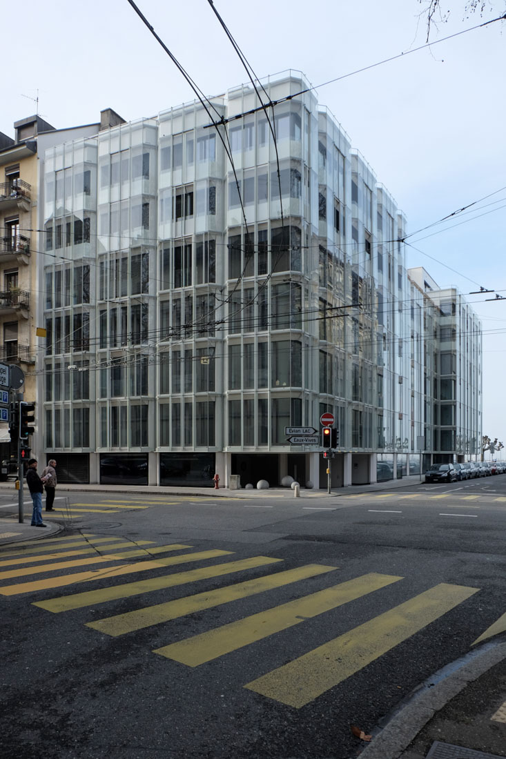 The building is located on an extremely deep and narrow parcel that connects the Quai Gustave-Ador with the Rue des Eaux Vives. In his draft, Marc-Joseph Saugey uses the articulation of the volumetry and floor plan to interpret the legal framework in favor of maximum profitability. The building is divided into three parts by a recess in the floor plan and the elevation of the building to the lake and the main street. This design strategy creates a building head facing the lake, and the building responds to neighboring buildings from the nineteenth century. In its uncompromisingly modern design language, the building also contrasts with the neighboring buildings. The V-shaped pillars on the facade are expressed as striking construction elements. There are bay-like windows between these supporting elements, so that the facade gains plasticity due to the recesses. Today the outer appearance has changed a lot. The solid parapets of the apartment floors can still be seen behind a continuous facade made of transparent glass. In