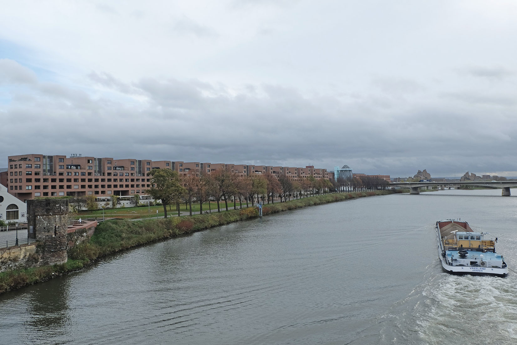 The Stoa Residential Complex, designed by Luigi Snozzi, makes part of the new residential estate, developed under the guideance of the Dutch architect Jo Coenen. Development of the so-called Céramique District were initiated at the end of the 1980s on the terrain of the former ceramic factory «Sphinx». The site on the banks of the Meuse is located opposite the old town and is not far from the train station. On an area of ​​about 25 hectares, residential and commercial buildings were created by different architects. The extraordinary residential building by Luigi Snozzi forms the last step in the construction of the new residential district. The 300-meter-long building spans between two public buildings. On one side is the famous Bonnefanten Museum by Aldo Rossi, on the other the new library by Jo Coenen. The Stoa residential building is in a prime location, directly adjacent to the Charles Eyckpark, which forms the transition to the river. The seven-storey building contains around 130 flats of different sizes and layouts. Luigi Snozzi applies a relatively large number of generously designed maisonette apartments. To avoid an excessively closed front to the river, the building was strongly articulated. The exceptionally long volume consists of sequence of twelve carefully designed T-shaped blocks, with the intention of achieving the greatest possible permeability. The repetition of the element creates a striking horizon with great recognition value. On the road side, the subdivision of the individual elements is emphasized, in contrast, on the opposite side, the continuity and length of the building is highlighted. Due to the plastic articulation the flats receive terraces in different arrangements towards the river. The transition between the private space and the park is articulated by a raised pedestal with an elongated pergola. On the pedestal are located the private gardens. In order to give the building a calm appearance despite the strong plastic articulation, all facades are made of red exposed masonry, and the window and door openings are repeated uniformly. By this design decision a high degree of uniformity is achieved.
