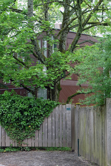 It is located in a narrow back road in Lenzburg, shielded from views by a wooden fence and several large trees. The buildings are described in the Guide to Swiss Architecture: "The diagonal, dark-stained timber shell of the residential building and the north-glazed brick cube of the studio with mortar "brows" emerging from the horizontal joints combine to create a harmonious entity in a garden of weeds. The construction of the residential building is of particular interest: a "concrete tree" rising from the cellar encloses the sanitary units and bears the wooden floor of the upper level and the timber roof. The façade is effectively a curtain-wall, expressed externally by its eroded corners." |
