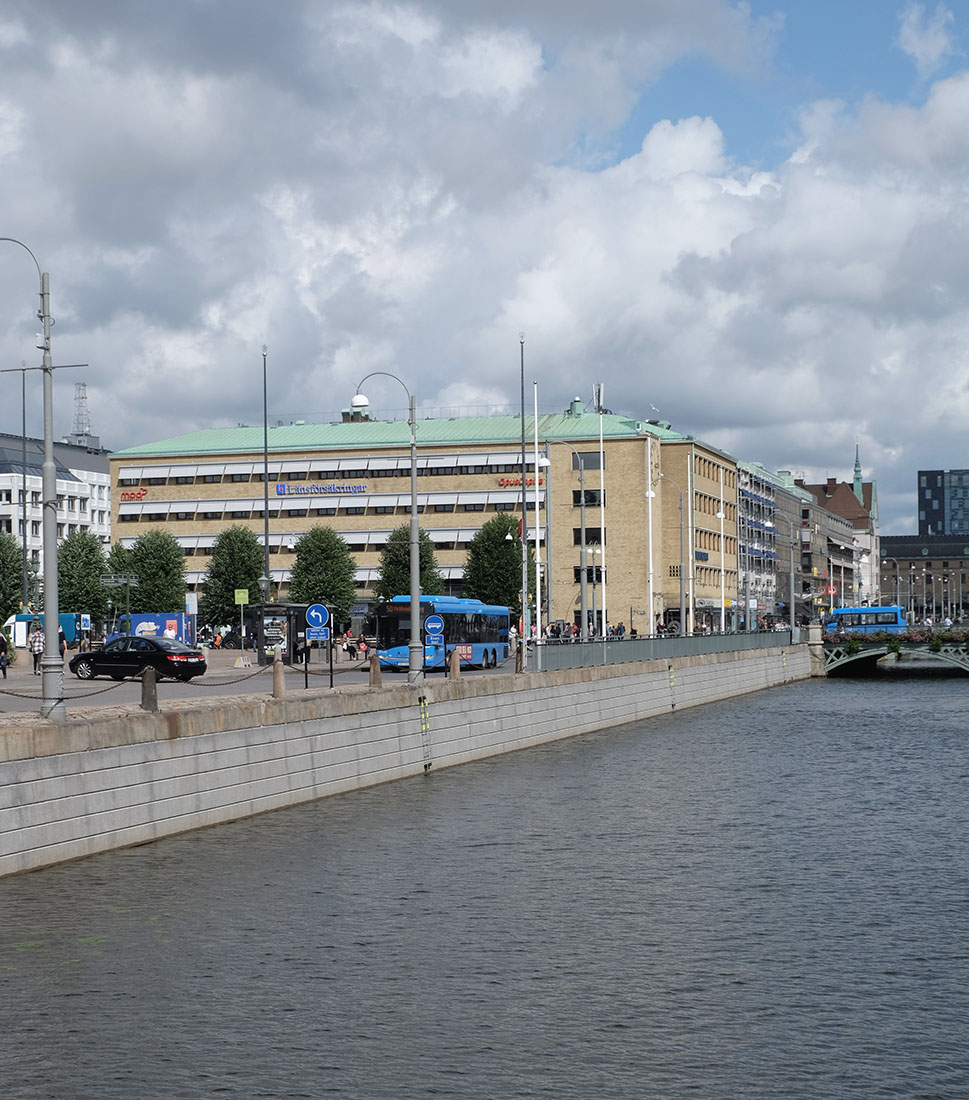 Built in 1937, Thulehuset in Gothenburg is a commercial building designed by Nils Einar Eriksson for the Lifförsäkrings AB Thule. The five-storey building is located on the corner of Norra Hamngatan 18 and Östra Hamngatan 30-34 in the district of Nordstaden. With this strictly functionalist building, the old "Wilson Palace" was created. An initial construction phase of the building was ready for occupation on October 1, 1936. Even in the autumn of the same year, the second construction phase in the direction of Köpmansgatan began. A characteristic feature of the Thulehuset is the big clock in the building corner. Above the main entrance is a sandstone relief by Ivar Johnsson. In 1946, the copper roof was created, and an apartment in the attic furnished. This apartment was later rebuilt into office space. In the 1950s, various minor adjustments were made to the shopping arcade on the ground floor. Das 1937 erbaute Thulehuset in Göteborg ist ein von Nils Einar Eriksson entworfenes Geschäftsgebäude für die Lifförsäkrings AB Thule. Das fünfstockige Bauwerk befindet sich an der Ecke von Norra Hamngatan 18 und Östra Hamngatan 30-34 im Stadtteil Nordstaden. Mit diesem streng funktionalistischen Gebäude wurde der alte "Wilson Palace" erstellt. Eine erste Bauetappe des Gebäudes war bereits am 1. Oktober 1936 bezugsbereit. Noch im Hebst des selben Jahres wurde mit der zweiten Bauetappe in Richtung Köpmansgatan begonnen. Ein charakteristisches Merkmal des Thulehuset ist die grosse Uhr in der Gebäudeecke. Über dem Haupteingang befindet sich ein Sandsteinrelief von Ivar Johnsson. Im Jahr 1946 wurde das Kupferdach erstellt, und eine Wohnung im Dachgeschoss eingerichtet. Diese Wohnung wurde später wiederum in Büroräume umgebaut. In den 1950er Jahren wurden verschiedene kleinere Anüassungen an der Ladenpassage im Erdgeschoss vorgenommen. |